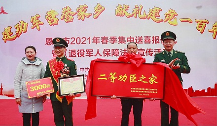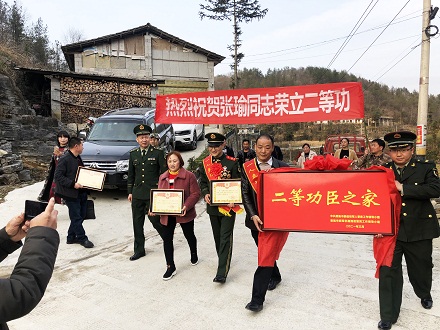 圖為軍地領(lǐng)導(dǎo)將立功喜報及牌匾送往立功官兵家中。張勇 攝
