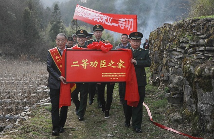 圖為軍地領(lǐng)導(dǎo)將立功喜報及牌匾送往立功官兵家中。彭磊 攝