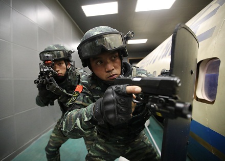 扮演歹徒的藍(lán)軍不按套路出牌,將飛機(jī)艙門用鐵絲鎖死,突擊隊(duì)員從艙外拉拽幾次無(wú)法突入。此時(shí),身為現(xiàn)場(chǎng)指揮員的彭星果斷下令,改用突擊車掛鎖拖拽、強(qiáng)行破門,兵分三路突入艙內(nèi)。當(dāng)槍聲突然從身后響起時(shí),藍(lán)軍被打了個(gè)措手不及,6名“歹徒”全部被“擊斃”。