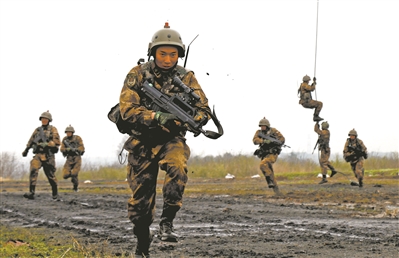 完成火力打擊后,數(shù)架運輸直升機從低空突入戰(zhàn)場,快速實施索降。著陸后,作戰(zhàn)隊員多路并進、奪控要點,并對機降地域縱深之“敵”展開清掃。