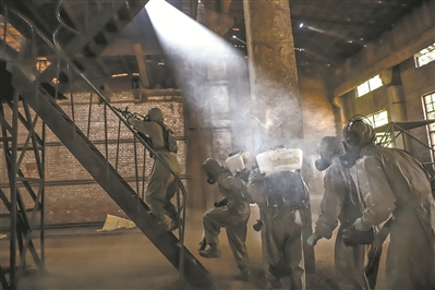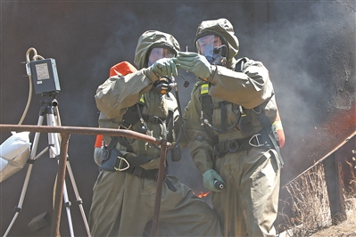 “3名‘暴恐分子’藏匿于化工廠二樓!”晨曦微露,偵察隊員段鳳喬一邊報告?zhèn)刹烨闆r,一邊掩護防化分隊?wèi)?zhàn)友對廠區(qū)泄漏化學(xué)物質(zhì)進(jìn)行處理。