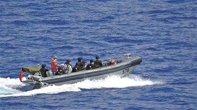 揚州艦隨即派出兩艘小艇,搭載陸戰(zhàn)隊員抓住稍縱即逝的戰(zhàn)機,隱蔽出擊。同時,艦艇火力支援組進行火力壓制,直升機空中掩護組在商船尾部繞飛,攻心喊話組持續(xù)實施攻心喊話。在各方密切配合下,水面突擊組成功控制商船,武力營救商船任務圓滿完成。