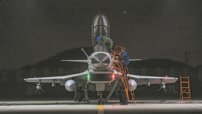 深夜,華東某機場萬籟俱寂。突然,一發(fā)綠色信號彈點亮夜空。伴著巨大的轟鳴聲,東部戰(zhàn)區(qū)海軍航空兵某旅數架戰(zhàn)機接續(xù)升空,投入高強度夜間飛行訓練。