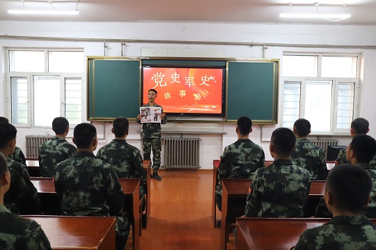 站在講臺上演講的叫崔浩天,是武警黑龍江總隊齊齊哈爾支隊剛?cè)胛榈男卤?。這個演講是支隊開展的“黨史軍史故事會”系列活動。