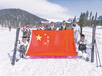 2021年4月,滕家?。ê笈庞胰﹨⒓印皣?guó)際軍事比賽-2021”雪地作戰(zhàn)行軍項(xiàng)目比賽時(shí),與戰(zhàn)友合影。楊再新 攝