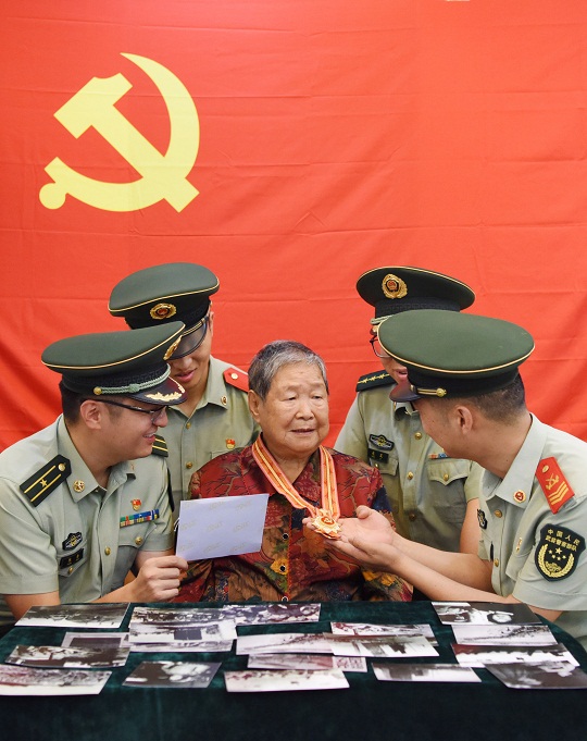 圖為馬毛姐為武警合肥支隊(duì)黨員代表講述支前故事。 朱立 攝