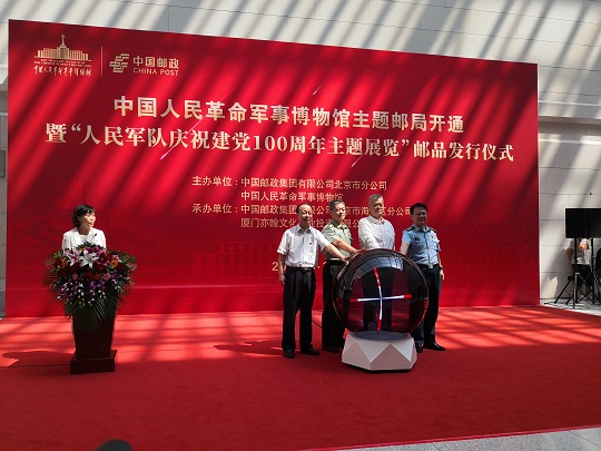 本報北京8月1日訊 記者陳麗平 見習記者韓瀟 今天上午,中國人民革命軍事博物館與中國郵政集團有限公司北京市分公司共同舉辦“中國人民革命軍事博物館主題郵局開通暨人民軍隊慶祝建黨100周年主題展覽郵品發(fā)行儀式”。中國人民革命軍事博物館館長李洪軍、政委劉銳與中國郵政集團有限公司北京市分公司總經(jīng)理徐茂君、黨委書記張利平共同為軍事博物館主題郵局銘牌揭牌。