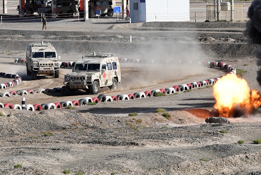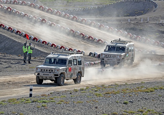 圖為中國(guó)陸軍參賽隊(duì)和烏茲別克斯坦參賽隊(duì)駕駛車(chē)輛飛速行進(jìn)。羅興倉(cāng) 攝