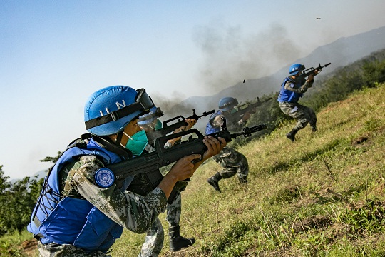 圖為在“共同命運(yùn)-2021”國際維和實(shí)兵演習(xí)中,我方參演分隊(duì)正在展開戰(zhàn)斗隊(duì)形。焦光輝 攝