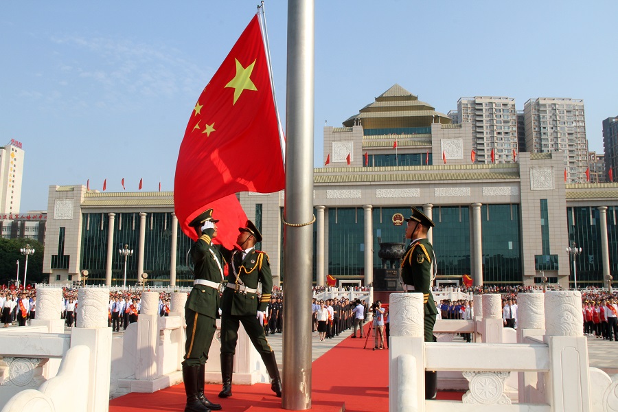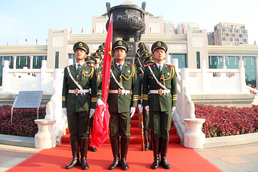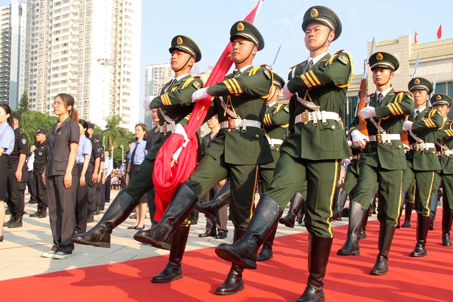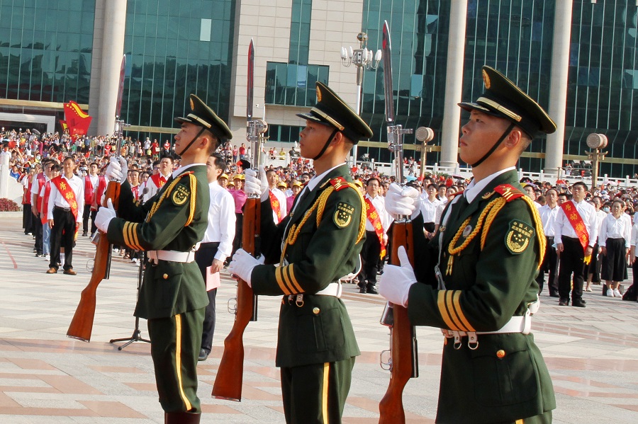 10月1日,在廣西壯族自治區(qū)南寧市,不少市民一大早就趕到民族廣場觀看升旗儀式,由武警廣西總隊(duì)南寧支隊(duì)15名官兵組成的國旗護(hù)衛(wèi)隊(duì)圓滿完成升旗任務(wù)。