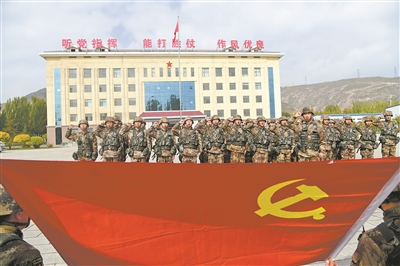 鐵心向黨,勇?lián)厝?。官兵們面向黨旗莊嚴宣誓。