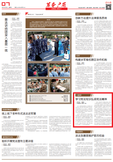 近年來(lái),火箭軍成立10余個(gè)普法講師團(tuán),針對(duì)新修訂、新出臺(tái)的兵役法、退役軍人保障法等法律法規(guī),分專(zhuān)題編寫(xiě)普法教案、制作微視頻,遴選骨干力量進(jìn)行專(zhuān)題授課輔導(dǎo),開(kāi)展重點(diǎn)法規(guī)政策解讀。針對(duì)民法典頒布實(shí)施,部隊(duì)各級(jí)采取網(wǎng)上聽(tīng)、線下學(xué)、有獎(jiǎng)答等形式,組織一次集中學(xué)習(xí)討論、推出一批精品學(xué)習(xí)課程、舉辦一場(chǎng)網(wǎng)上知識(shí)競(jìng)答、開(kāi)展一期專(zhuān)項(xiàng)送法下連,提高了廣大官兵依法維權(quán)能力。