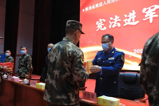 圖② 青海軍地法官向官兵代表贈(zèng)送法律書(shū)籍。羅元?jiǎng)P 攝