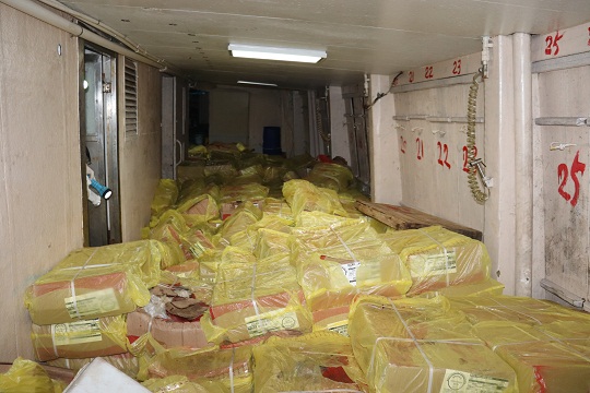 圖為查獲的船艙內(nèi)走私凍品。廣東海警局 供圖