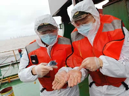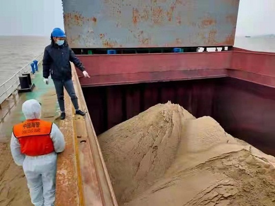 3月21日凌晨,該局巡邏艇在寶山附近海域巡邏時(shí)發(fā)現(xiàn)1艘船舶形跡可疑,該局執(zhí)法人員嚴(yán)格按照當(dāng)前疫情防控要求,穿戴好防疫裝備,攜帶消毒設(shè)備前往該嫌疑船舶進(jìn)行登臨檢查。經(jīng)査,該船舶貨艙內(nèi)滿載疑似海砂類砂石,砂石里混雜大量碎貝殼,隨后執(zhí)法人員在所有船艙依次提取樣品,均發(fā)現(xiàn)船舶所載貨物與貨運(yùn)清單明顯不符,且相關(guān)人員無法提供合法齊全手續(xù)。目前,案件正在進(jìn)一步偵辦中。