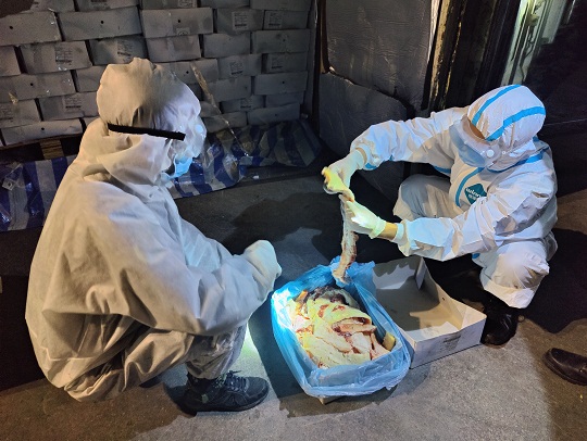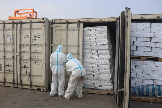 3月13日17時(shí)許,江門海警局根據(jù)情報(bào)獲悉,在江門市黃茅海對(duì)開海域有走私活動(dòng)。該局立即派遣2艘執(zhí)法艇前往目標(biāo)海域進(jìn)行查緝。當(dāng)日18時(shí)許,該局執(zhí)法員通過(guò)AIS在目標(biāo)海域發(fā)現(xiàn)一艘可疑船只,遂即拉響警報(bào),表明身份,責(zé)令可疑船只立即停船接受檢查。在可疑船只停船后,經(jīng)執(zhí)法員登臨檢查發(fā)現(xiàn),該船舶上裝載有29個(gè)長(zhǎng)20英尺的集裝箱,集裝箱中載有大量?jī)銎罚瑑銎吠獍b上均有明顯的外文標(biāo)識(shí),由于天氣炎熱且船上沒有任何冷鏈保存裝置,部分凍品已出現(xiàn)腐敗發(fā)臭跡象,隨船未發(fā)現(xiàn)該批凍品任何合法來(lái)源和檢驗(yàn)檢疫證明,執(zhí)法員隨即將涉案船舶及所載凍品依法進(jìn)行查扣。