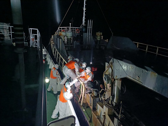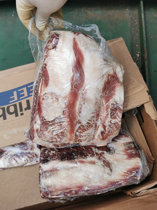 3月30日,涉案走私團(tuán)伙準(zhǔn)備在山東威海海域?qū)嵤┳咚椒缸锘顒?dòng)。得知線索后,山東海警局立即派遣威海海警局執(zhí)法艦艇前往目標(biāo)海域開(kāi)展查緝。在執(zhí)法艦艇發(fā)現(xiàn)嫌疑船舶并靠近過(guò)程中,該走私船舶突然加速意欲逃離,海警執(zhí)法員果斷將其逼停,并組織船舶登檢。經(jīng)查,該船于3月23日自韓國(guó)裝載無(wú)合法來(lái)源和未經(jīng)檢驗(yàn)檢疫的日本進(jìn)口和牛肉后,關(guān)閉AIS設(shè)備進(jìn)入威海海域,被山東海警局當(dāng)場(chǎng)查獲。