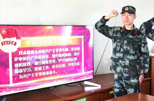 “我志愿加入中國(guó)共產(chǎn)主義青年團(tuán),堅(jiān)決擁護(hù)中國(guó)共產(chǎn)黨的領(lǐng)導(dǎo)……”“就在今天,我光榮地加入了中國(guó)共產(chǎn)主義青年團(tuán),成為其中一份子。在今后的的訓(xùn)練工作中,我會(huì)更加努力刻苦,嚴(yán)格要求自己,把青春夢(mèng)想融入海疆,立足本職崗位,以青春的名義,志存高遠(yuǎn),腳踏實(shí)地,讓自己的青春綻放光彩”。