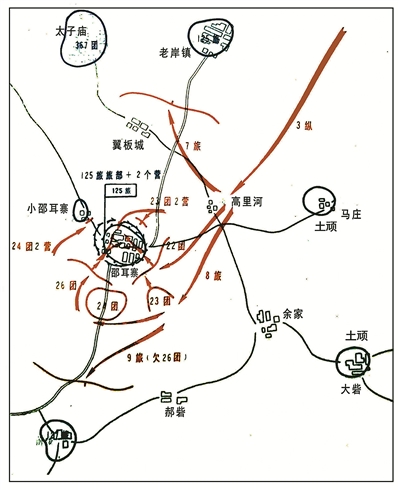 晉冀魯豫野戰(zhàn)軍第3縱隊接到戰(zhàn)斗命令后,要求各部隊迅速行動,直插邵耳寨附近的指定位置,向敵第125旅發(fā)起進(jìn)攻。具體部署為:第8旅(配屬第9旅第26團(tuán))擔(dān)負(fù)攻打邵耳寨的任務(wù);第7旅在黃村寨、謝家城一線占領(lǐng)陣地,阻擊南援之?dāng)常?dān)任預(yù)備隊;第9旅(欠第26團(tuán))在張王寨集、大沙邱一線占領(lǐng)陣地,阻擊北援之?dāng)臣胺罃惩粐?/p>