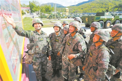 炎炎夏日,練兵正酣。第82集團(tuán)軍某旅注重發(fā)揮榮譽(yù)激勵(lì)作用,在訓(xùn)練場(chǎng)立起榮譽(yù)墻,把官兵的先進(jìn)事跡及時(shí)“曬”出來,以此激勵(lì)大家學(xué)習(xí)先進(jìn)、爭(zhēng)當(dāng)標(biāo)兵。圖為訓(xùn)練間隙,五連戰(zhàn)士代鵬(左一)向戰(zhàn)友介紹自己的比武奪冠經(jīng)歷。陶磊 攝