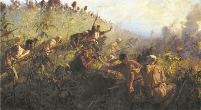 青紗帳里游擊隊(duì)員逞英豪(油畫)韋啟美 作