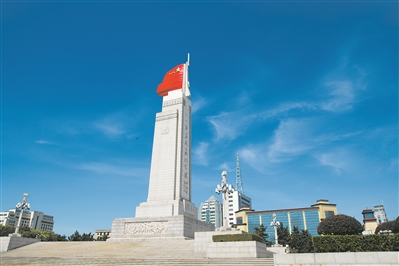 圖①:2022年八一建軍節(jié)前夕,南昌市八一廣場(chǎng)上,八一南昌起義紀(jì)念塔頂端鮮紅的軍旗在陽(yáng)光下熠熠生輝。盧成行攝