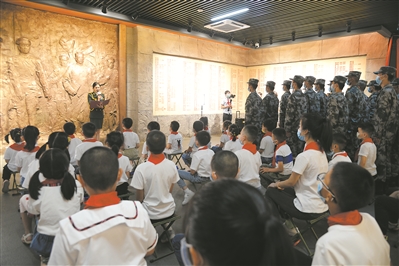 圖②:南昌警備區(qū)官兵和駐地學(xué)生在南昌八一起義紀(jì)念館的起義參加者名錄墻前學(xué)習(xí)參觀。徐婉攝