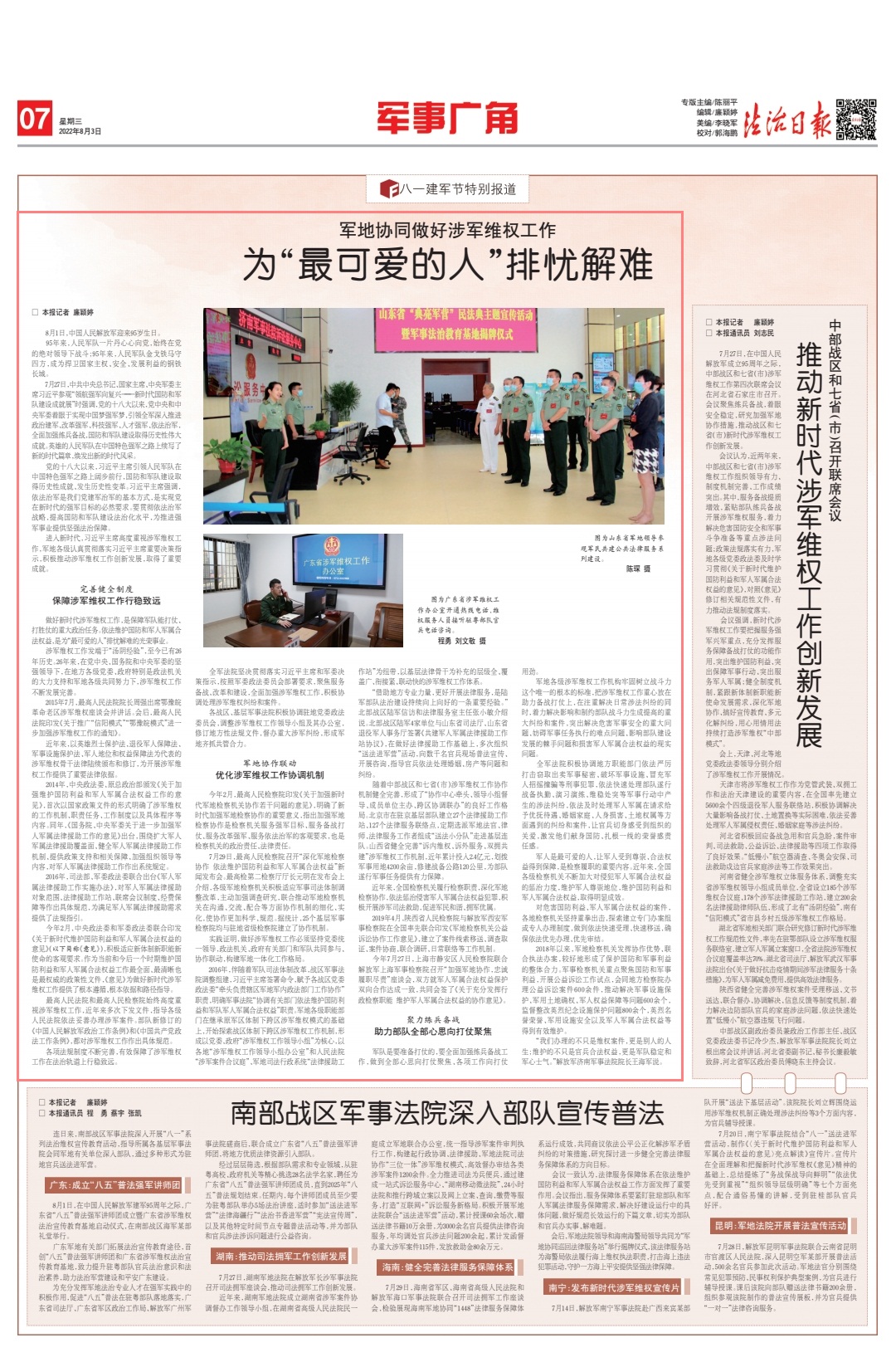 各戰(zhàn)區(qū)、基層軍事法院積極協(xié)調(diào)駐地黨委政法委員會(huì),調(diào)整涉軍維權(quán)工作領(lǐng)導(dǎo)小組及其辦公室,修訂地方性法規(guī)文件,督辦重大涉軍糾紛,形成軍地齊抓共管合力。