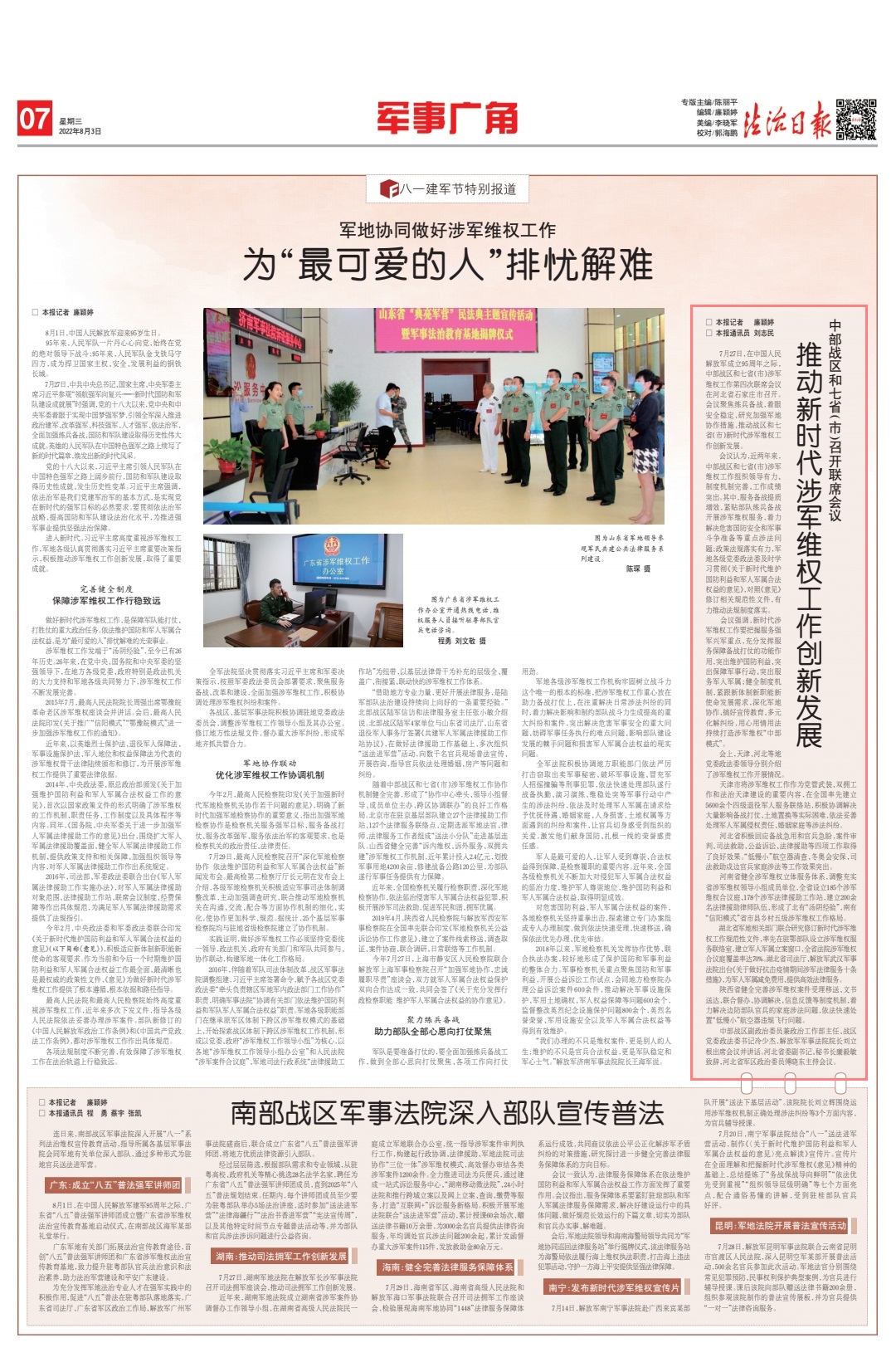 湖北省軍地相關(guān)部門聯(lián)合研究修訂新時(shí)代涉軍維權(quán)工作規(guī)范性文件,率先在駐鄂部隊(duì)設(shè)立涉軍維權(quán)服務(wù)聯(lián)絡(luò)室,建立軍人軍屬立案窗口,全省法院涉軍維權(quán)合議庭覆蓋率達(dá)70%。湖北省司法廳、解放軍武漢軍事法院出臺(tái)《關(guān)于做好抗擊疫情期間涉軍法律服務(wù)十條措施》,為軍人軍屬減免費(fèi)用、提供高效法律服務(wù)。