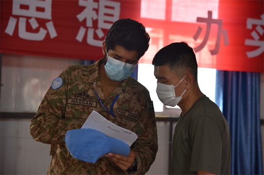 圖為維和醫(yī)療分隊(duì)隊(duì)員向聯(lián)剛團(tuán)官員咨詢相關(guān)法律問(wèn)題。
