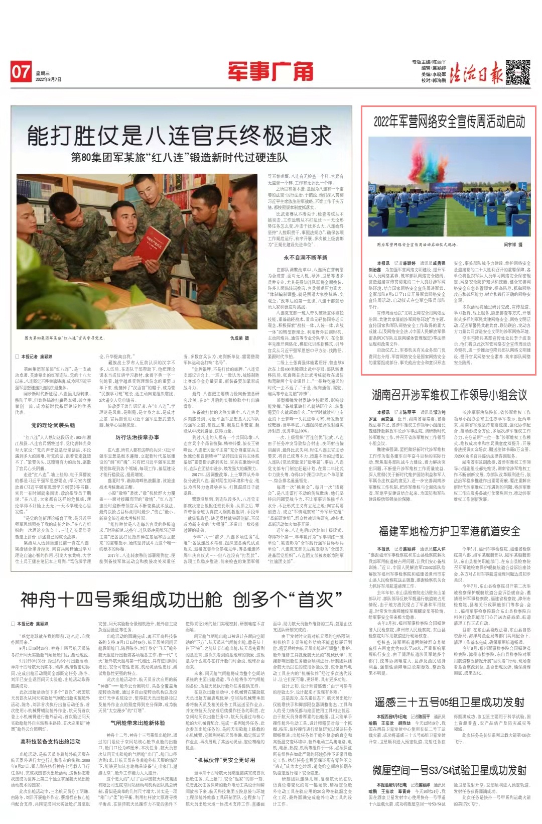 本報(bào)訊 記者廉穎婷 通訊員戚勇強(qiáng) 劉治鑫 羅健 閔宇祥 任強(qiáng)盛 為加強(qiáng)軍營(yíng)網(wǎng)絡(luò)文明建設(shè),提升軍隊(duì)人員網(wǎng)絡(luò)素養(yǎng),筑牢部隊(duì)網(wǎng)絡(luò)安全防線(xiàn),營(yíng)造迎接宣傳貫徹黨的二十大良好涉軍網(wǎng)絡(luò)環(huán)境,結(jié)合國(guó)家網(wǎng)絡(luò)安全宣傳周進(jìn)軍營(yíng),全軍部隊(duì)9月5日至11日開(kāi)展軍營(yíng)網(wǎng)絡(luò)安全宣傳周活動(dòng),啟動(dòng)儀式在空軍空降兵部隊(duì)舉行。