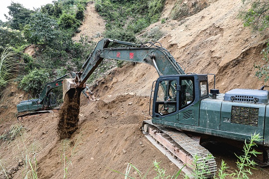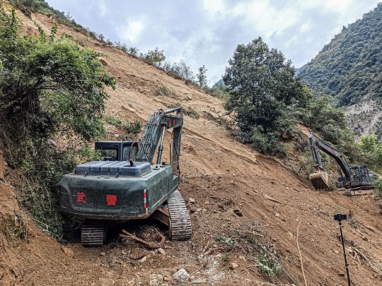 圖為9月8日,武警第二機(jī)動(dòng)總隊(duì)官兵在懸崖處全力搶修通往聯(lián)合村唯一道路,兩臺(tái)挖掘機(jī)協(xié)同作業(yè)。