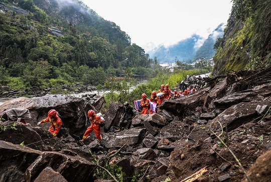 圖為武警四川總隊涼山支隊官兵徒步奔赴石棉縣草科藏族鄉(xiāng)開展搜救工作。