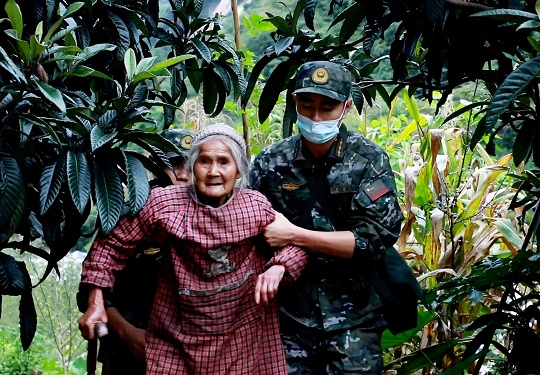 圖為武警官兵在石棉縣草科鄉(xiāng)農家村轉移受災群眾。