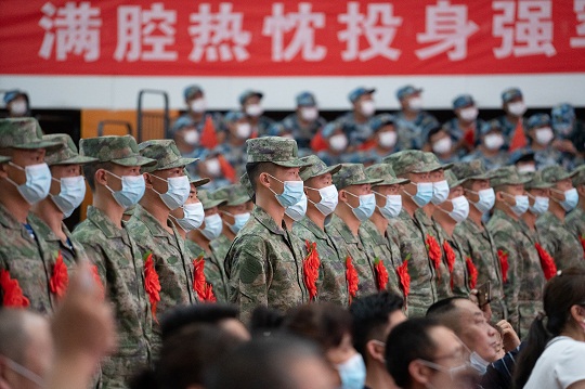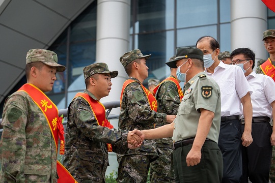 圖為軍地領(lǐng)導(dǎo)為新兵出征壯行。