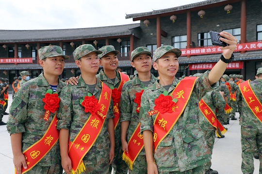 圖為即將奔赴軍營的新兵正在用手機(jī)自拍合影留念。