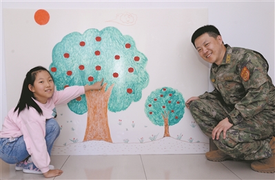 在張威偉家的墻上,畫(huà)著一棵蘋(píng)果樹(shù)。不知從哪天起,蘋(píng)果樹(shù)旁又“長(zhǎng)”出一棵小蘋(píng)果樹(shù)。女兒說(shuō),爸爸表現(xiàn)好,她就用紅紙剪一個(gè)蘋(píng)果貼在上面;表現(xiàn)不好,蘋(píng)果樹(shù)上就會(huì)長(zhǎng)出藍(lán)色的蘋(píng)果。