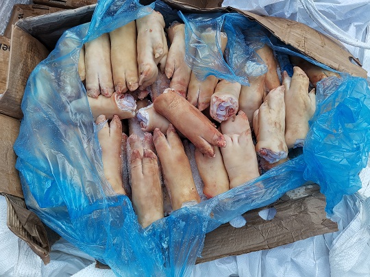 當日上午8時許,廣東海警局接群眾舉報,在廣東江門臺山市烏豬島對開海域有人進行涉嫌走私活動。該局立即指派廣東江門海警局執(zhí)法艇前往目標海域進行查緝。9時30分許,執(zhí)法員在目標海域成功攔截該艘目標船舶,經(jīng)登臨檢查發(fā)現(xiàn),船上共有5人,船艙內裝有大量白色塑料袋,袋內紙箱裝有豬肚、豬蹄、牛肚等凍品約130噸,船上人員均無法提供該批凍品的合法來源及檢驗檢疫證明,涉嫌走私。