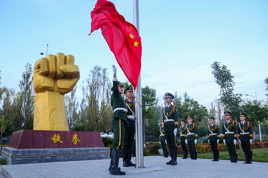 升旗是一項(xiàng)神圣的儀式,更是對(duì)靈魂的一次洗禮。當(dāng)天,該總隊(duì)各基層部隊(duì)也紛紛舉行了升旗儀式,為祖國(guó)慶生。在海拔4800多米的昆侖山,擔(dān)負(fù)青藏鐵路昆侖山隧道守護(hù)任務(wù)的官兵升起國(guó)旗。這里高寒缺氧、風(fēng)雪彌漫,條件極為艱苦,但官兵高喊“寧可生命透支,不讓使命欠賬”的口號(hào),扎根高原、無(wú)悔奉獻(xiàn)。升旗儀式結(jié)束后,戰(zhàn)士羅昌強(qiáng)深情地說(shuō):“感覺(jué)所有堅(jiān)守和辛苦,就為了這一面‘中國(guó)紅’!”