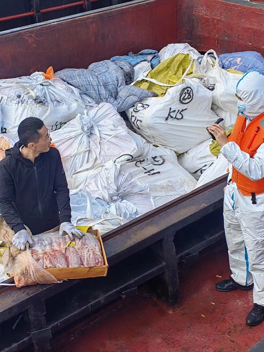 執(zhí)法人員登臨檢查發(fā)現(xiàn),該嫌疑船舶載有無合法來源證明的牛肉、牛肚等凍品共計(jì)約200余噸,涉嫌走私,海警執(zhí)法員當(dāng)場(chǎng)對(duì)涉案船舶及所載凍品進(jìn)行扣押。目前,該局已協(xié)調(diào)防疫部門對(duì)涉案凍品進(jìn)行取樣和消殺,對(duì)涉案人員進(jìn)行核酸檢測(cè)及隔離,案件正在進(jìn)一步偵辦中。