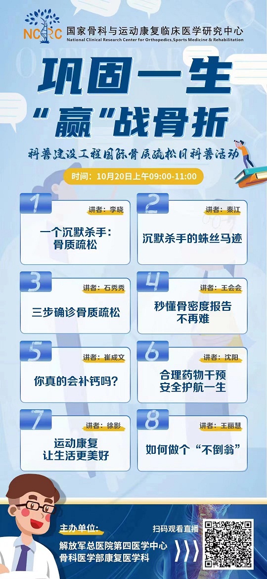 本報訊 見習記者韓瀟 通訊員李曉 石秀秀 10月20日,是世界衛(wèi)生組織確立的“國際骨質疏松日”,今年中國的主題是“鞏固一生,贏戰(zhàn)骨折”。解放軍總醫(yī)院第四醫(yī)學中心骨科醫(yī)學部康復醫(yī)學科充分利用國家骨科與運動康復臨床醫(yī)學研究中心平臺,即骨科與運動康復領域唯一的國家級臨床醫(yī)學研究中心,在“科普建設工程”版塊開展線上科普宣傳活動?;顒又?,共有1萬余名患者及家屬登陸直播間觀看。這是該醫(yī)學部貫徹落實“健康中國2030發(fā)展綱要”的實際行動,目的是關注全國軍民各個年齡段骨骼健康,引導遠離骨質疏松危害,降低發(fā)生脆性骨折的風險,提高健康生活質量。