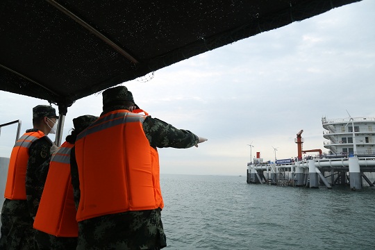 圖為山東海警局執(zhí)法員檢查涉海平臺建設情況。盧煜萱 攝