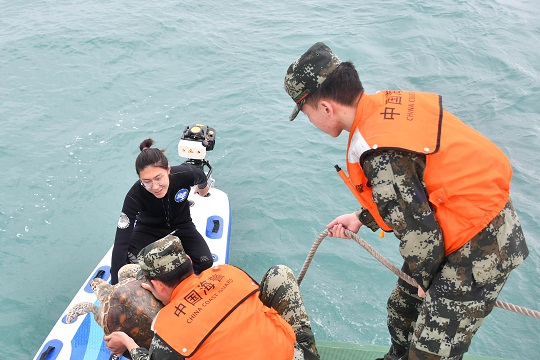 圖為海南海警局執(zhí)法員發(fā)現(xiàn)迷路“綠海龜”將其移交給研究所工作人員送回保護區(qū)。吳昊 攝