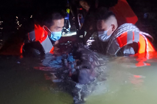 圖為福建平潭海警局執(zhí)法員成功救助一只擱淺海豚。