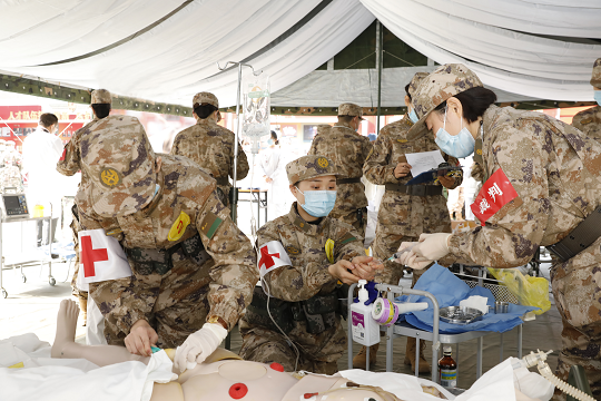 隨著指揮員一聲令下,一場綜合戰(zhàn)傷救治比武考核拉開帷幕。來自各科室的十支隊伍,接受高難度課目和逼真戰(zhàn)場環(huán)境的考驗。