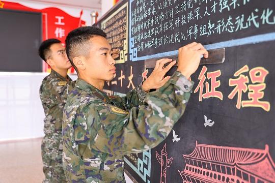 圖為官兵正在進(jìn)行“贊頌十年成就,奮進(jìn)新時(shí)代”板報(bào)創(chuàng)作。