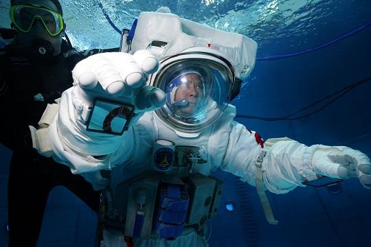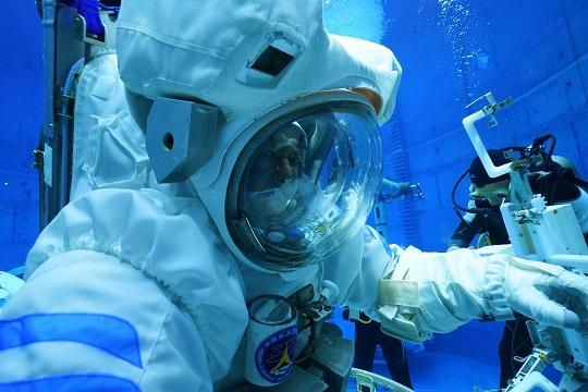 在圓形的模擬失重水槽中,航天員穿著數(shù)百公斤的水下服懸浮在藍(lán)色深水中。水下訓(xùn)練服相當(dāng)于一個“人”形飛船,是個鋼性結(jié)構(gòu),張陸的肩比較寬,每次把自己的兩只胳膊塞進(jìn)服裝里或者出服裝,都要費盡九牛二虎之力。在水里一待就是五六個小時,整個人的四肢被固定在水下服里,癢了痛了都只能咬牙堅持,餓了渴了只能喝水。