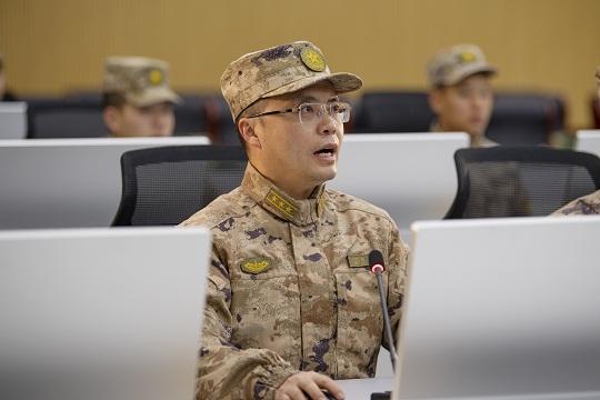 圖為丁國林正在組織對抗訓(xùn)練導(dǎo)調(diào)作業(yè)。