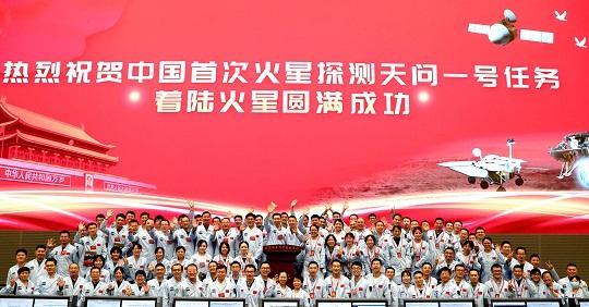 圖為北京航天飛行控制中心青年科技人才群體慶祝我國首次火星探測天問一號任務著陸火星成功。