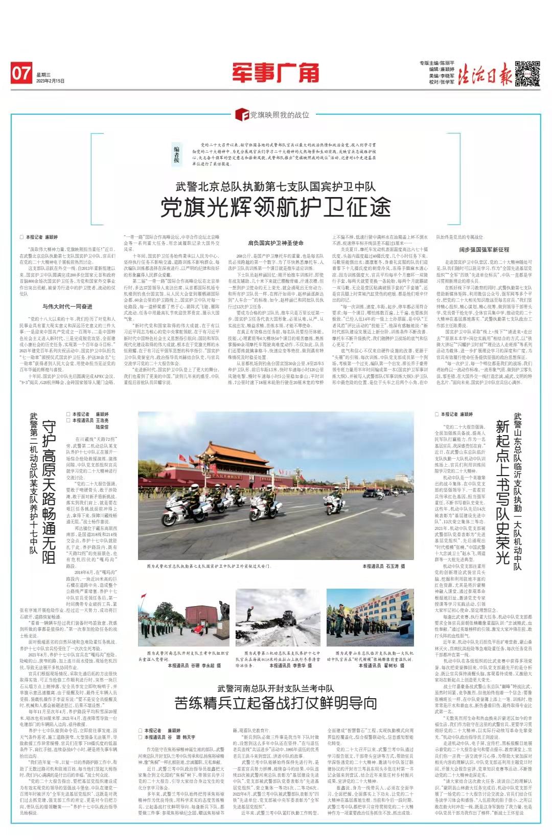 黨的二十大召開以來,駐守祖國各地的武警部隊官兵以最大的政治熱情和政治自覺,投入到學(xué)習(xí)貫徹黨的二十大精神中。為充分展現(xiàn)官兵們學(xué)習(xí)二十大精神的火熱場景和生動實踐,反映官兵忠誠維護核心、矢志奮斗強軍的堅定意志和嶄新風(fēng)貌,武警部隊推出“黨旗映照我的戰(zhàn)位”活動,記者對4個先進基層單位進行了采訪報道。